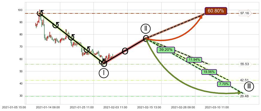 从2021-01-15 10:00至2021-01-28 16:00,共包含71个小时,阶段股价下跌-28.97%,阶段股价变动位移路程比: 1 : 3