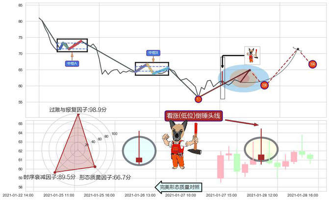 ➢ 🕰 价格走势在2021-01-28 10:00:00至2021-01-28 10:00:00期间形成看涨(低位)倒锤头线,残存影响值:6.41