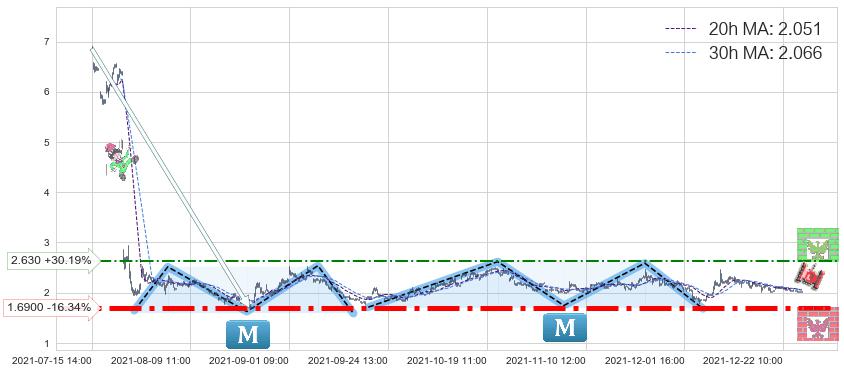 ♘ 支撑价格位1.6900,可信任强度88.09%,距离最后交易2021-12-27 15:00形成的收盘价格2.020相差 -16.34%