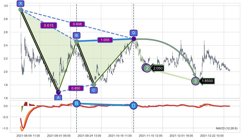 ➢ 谐波价格D点比B点高 ⤴,【MACD】指标D点比B点低 ⤵️