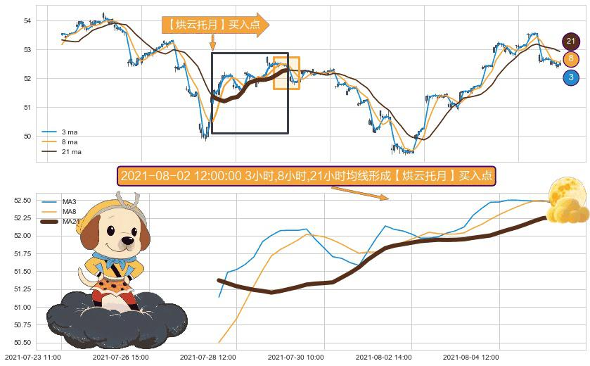 形态多维评估: ⚀ 2021-07-28 10:00:00小时-2021-08-05 13:00:00小时显现 3小时-8小时-21小时均线 【烘云托月】买入点 看多信号,后市看涨,买入
