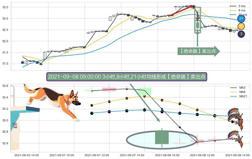 形态多维评估: ⚀ 2021-09-08 09:00:00小时显现 3小时-8小时-21小时均线 【绝命跳】卖出点 看空信号,后市看跌,卖出