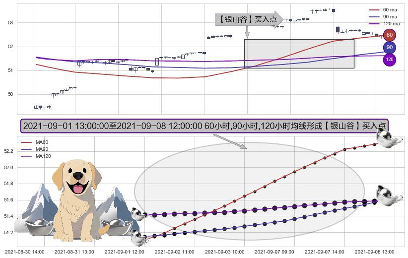 形态多维评估: ⚀ 2021-09-01 14:00:00-小时至2021-09-08 12:00:00-小时显现 60小时-90小时-120小时均线 【银山谷】买入点 看多信号,后市看涨,买入
