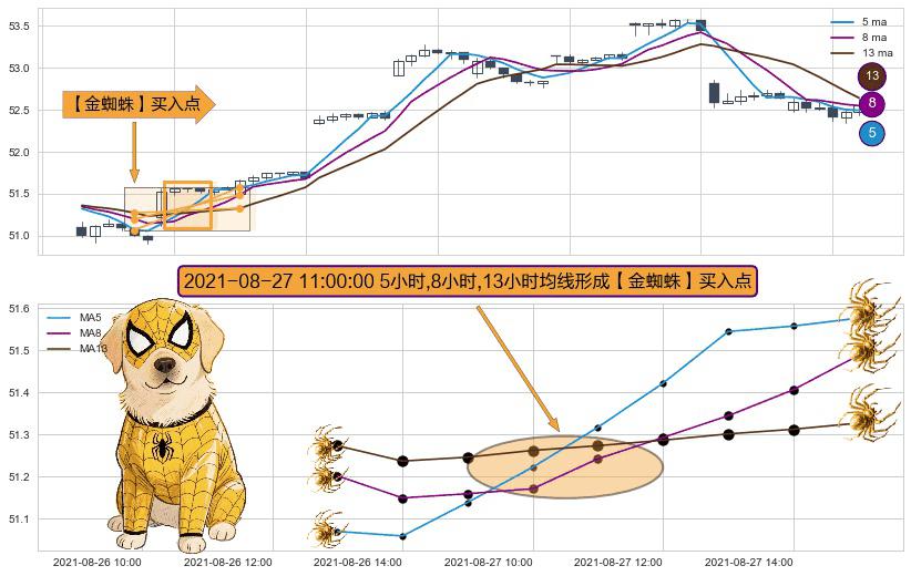 形态多维评估: ⚀ 2021-08-27 11:00:00小时显现 5小时-8小时-13小时均线 【金蜘蛛】买入点 看多信号,后市看涨,买入