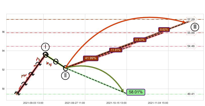 ➢ 循环浪继续向上【最低】位置(10-19:10, 54.46),匹配聚类样本比例28.36%, 可能性概率11.91%