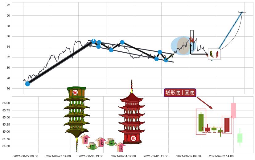 | 7 🅚:塔形底 | 圆底 ➕ 🌊:波浪理论猜想下跌浪5已形成,猜想后续形成abc反弹上涨(均值回复) ☞ 看多信号 ⇥ 【🅚线】交织【图形】⇥ 综合量化分数: 52 | > |