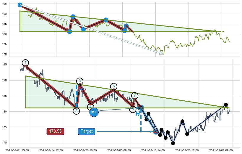 ➣ 【已确认突破】下降三角形整理 起点:07-01:10,突破点:08-09:13,形态共171交易小时