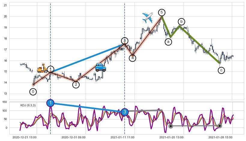 ➢ 第一, 三驱动浪端点:【KDJ】走势出现【常规背离 & 反转信号】背离程度67.65%,背离夹角角度78.0˚,背离程度较大