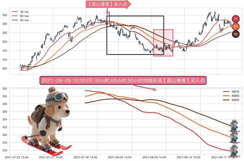 形态多维评估: ⚀ 2021-07-29 13:00:00小时-2021-08-17 12:00:00小时显现 30小时-60小时-90小时均线 【高山滑雪】买入点 看多信号,后市看涨,买入