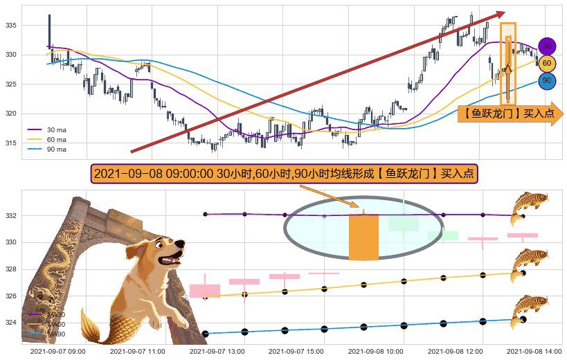 形态多维评估: ⚀ 2021-09-08 09:00:00小时显现 30小时-60小时-90小时均线 【鱼跃龙门】买入点 看多信号,后市看涨,买入