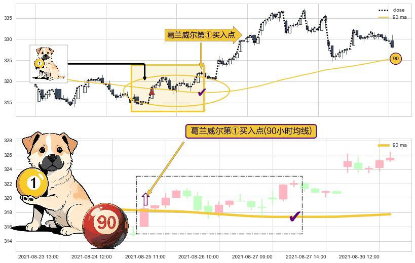 形态多维评估: ⚀ 2021-08-25 09:00:00-小时显现 葛兰威尔均线 90小时均线 第买①入点 走势反转见底信号,后市看涨,买进信号