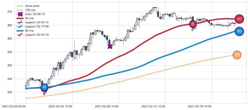 上涨趋势02-02 09:00-02-19 12:00,均线40, 80确认关键支撑2处