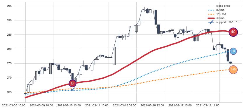 上涨趋势03-05 16:00-03-19 15:00,均线40确认关键支撑1处
