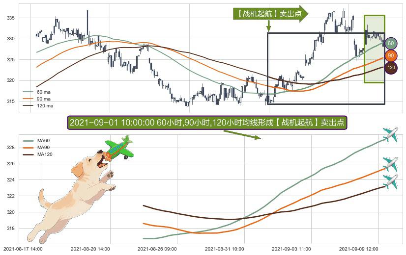 形态多维评估: ⚀ 2021-08-24 11:00:00小时-2021-09-09 14:00:00小时显现 60小时-90小时-120小时均线 【战机起航】卖出点 看空信号,后市看跌,卖出