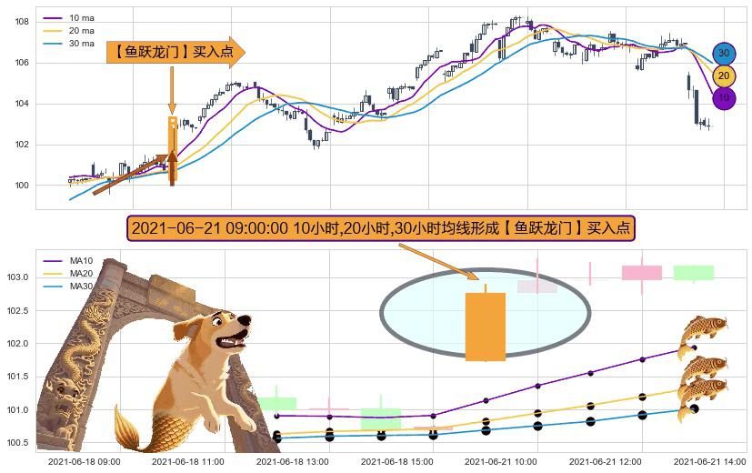 形态多维评估: ⚀ 2021-06-21 09:00:00小时显现 10小时-20小时-30小时均线 【鱼跃龙门】买入点 看多信号,后市看涨,买入