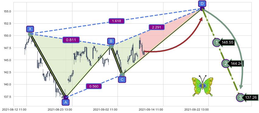 ➣ 未完成【蝴蝶】形态起点X: 08-12:15, 已到达C点: 09-03:10, 预测最终D点: 09-21:14, 共185交易小时