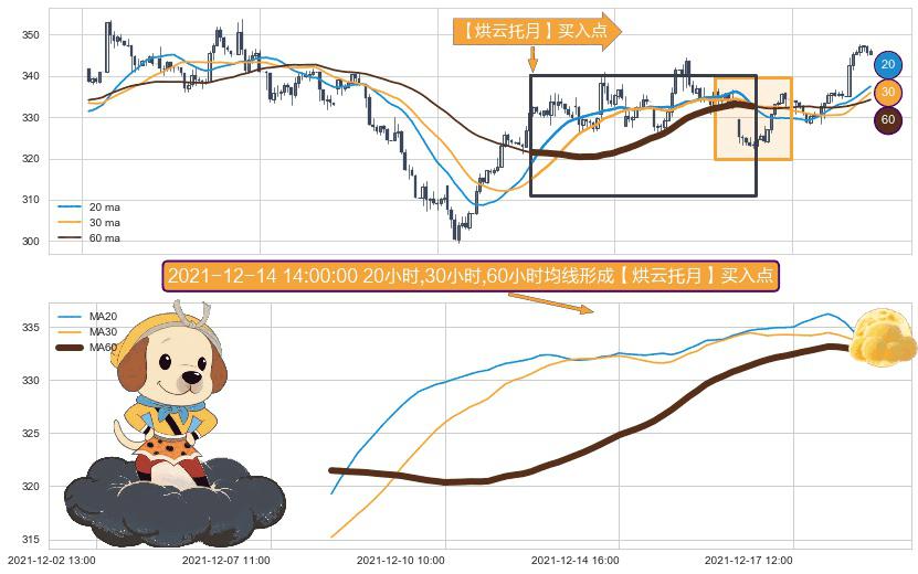 形态多维评估: ⚀ 2021-12-08 11:00:00小时-2021-12-20 13:00:00小时显现 20小时-30小时-60小时均线 【烘云托月】买入点 看多信号,后市看涨,买入