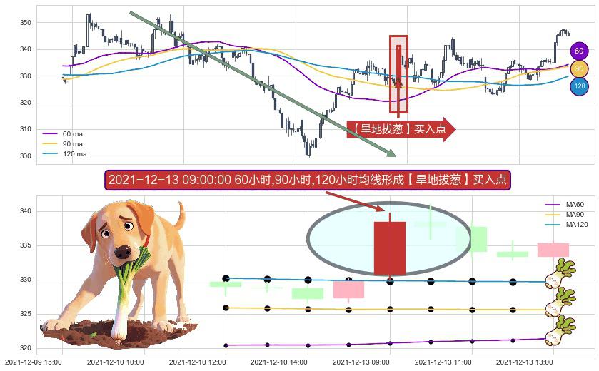 形态多维评估: ⚀ 2021-12-13 09:00:00小时显现 60小时-90小时-120小时均线 【旱地拔葱】买入点 看多信号,后市看涨,买入