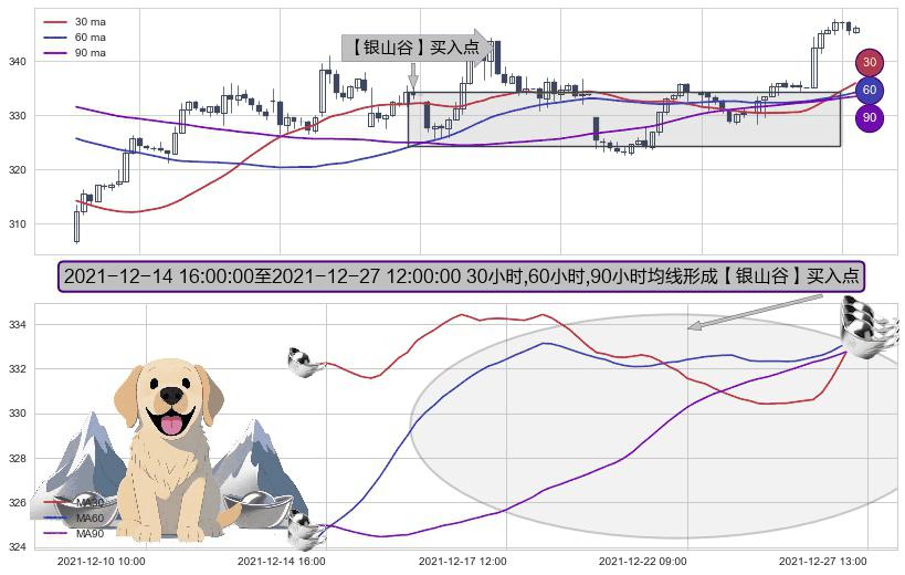 形态多维评估: ⚀ 2021-12-15 09:00:00-小时至2021-12-27 12:00:00-小时显现 30小时-60小时-90小时均线 【银山谷】买入点 看多信号,后市看涨,买入