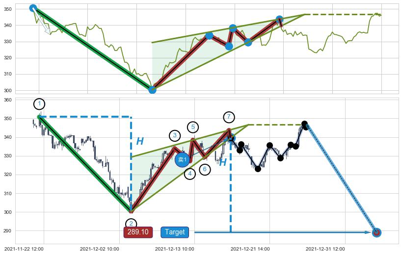 从2021-12-14 14:00至2021-12-20 13:00,共包含32个小时,阶段股价下跌-3.30%,阶段股价变动位移路程比: 1 : 5