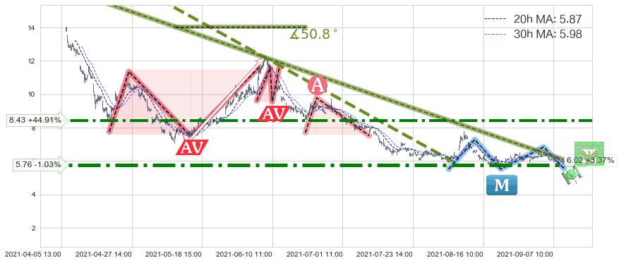 🦴 长线均值回复组合短线趋势跟踪[强阻力信号]2021-04-06 13:00-2021-09-09 15:00下跌趋势依然成立(下跌趋势跟踪依然存在),短线价格略微上行反弹(均值回复猜想),即将接近下跌趋势提供的未破位阻力价格:6.02。