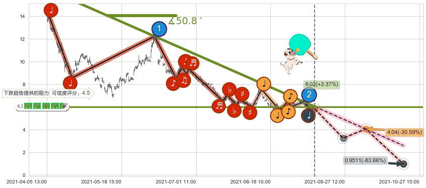 ♘ 在最后的下跌阶段2021-04-06 13:00至2021-09-09 15:00,存在 持续未破位的阻力位 ,阻力价格6.02,可信任强度88.55%,其距离最后价格5.82相差 +3.37%