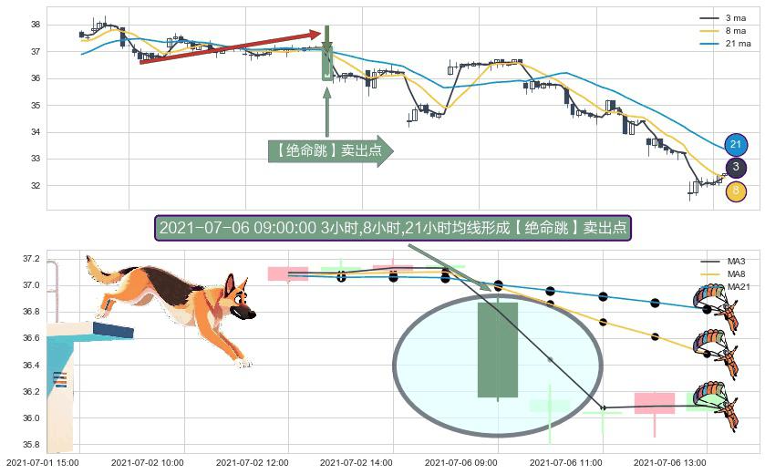 形态多维评估: ⚀ 2021-07-06 09:00:00小时显现 3小时-8小时-21小时均线 【绝命跳】卖出点 看空信号,后市看跌,卖出