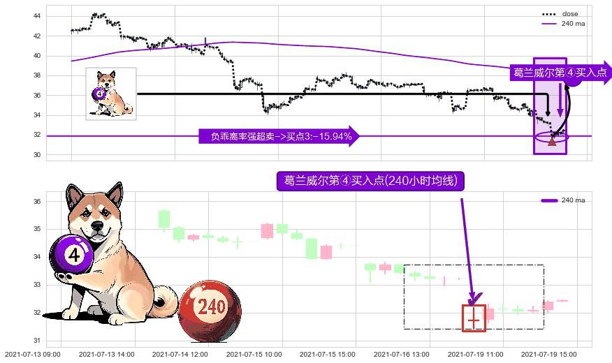 形态多维评估: ⚀ 2021-07-19 09:00:00-小时显现 葛兰威尔均线 240小时均线 第④买入点 下降趋势均值回复的短线反弹信号,后市看涨,买进信号