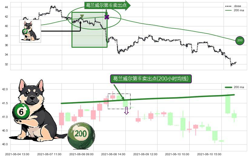 形态多维评估: ⚀ 2021-06-08 14:00:00-小时显现 葛兰威尔均线 200小时均线 第⑥卖出点 走势反转见顶信号,后市看跌,卖出信号