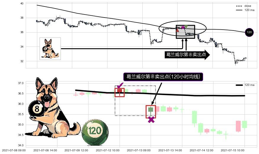 形态多维评估: ⚀ 2021-07-13 09:00:00-小时显现 葛兰威尔均线 120小时均线 第⑧卖出点 下降趋势的中继信号,后市看跌,卖出信号