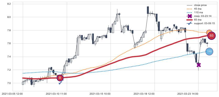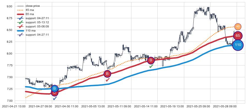 上涨趋势04-21 13:00-05-28 09:00,均线65, 110确认关键支撑3处