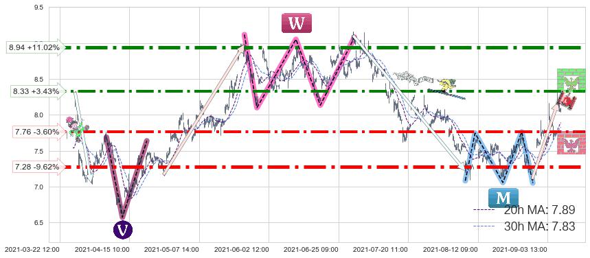 ♘ 阻力价格位8.94,可信任强度93.92%,距离最后交易2021-09-09 14:00形成的收盘价格8.05相差 +11.02%