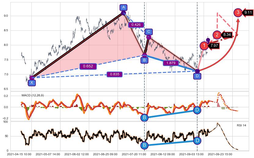 ➢ 谐波价格D点比B点低 ⤵,【MACD】指标D点比B点高 ⤴️