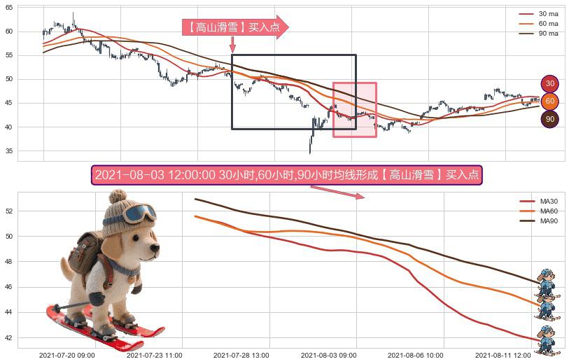 形态多维评估: ⚀ 2021-07-23 14:00:00小时-2021-08-11 14:00:00小时显现 30小时-60小时-90小时均线 【高山滑雪】买入点 看多信号,后市看涨,买入