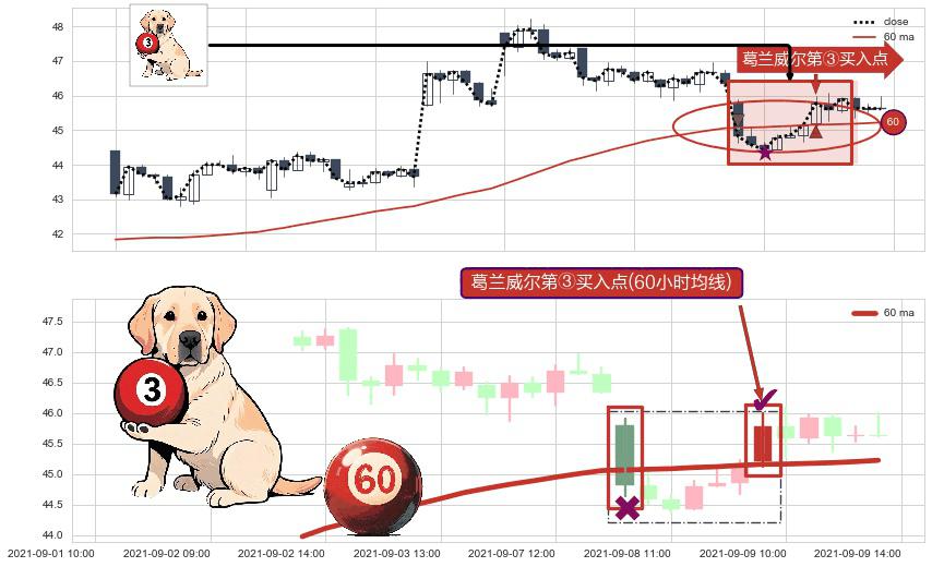 形态多维评估: ⚀ 2021-09-09 09:00:00-小时显现 葛兰威尔均线 60小时均线 第③买入点 上升趋势的中继信号,后市看涨,买进信号