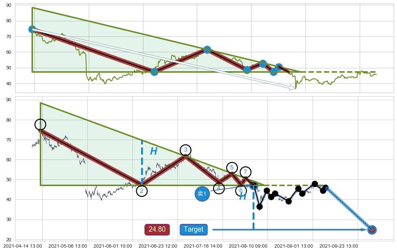 ➢ 最小中继整理跌幅→𝐇: 33.10 (𝐇楔型旗杆的长度:楔型起点→顶点)
