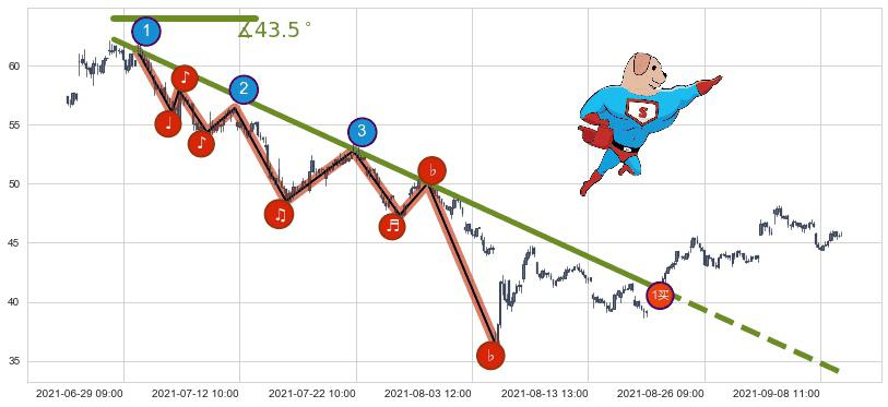 从2021-06-28 11:00至2021-08-23 09:00,共包含237个小时,阶段股价下跌-34.25%,阶段股价变动位移路程比: 1 : 6,下跌趋势角度: 43.5,2021-08-05 09:00向↘︎形成缺口,跳空下跌-18.10%˚