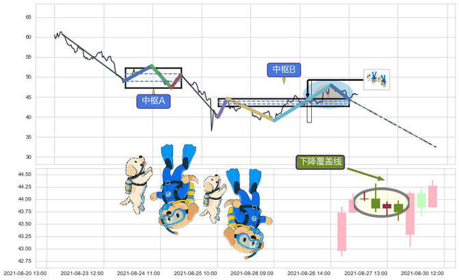 ➣ 下降覆盖线 + 缠论中枢点破位中枢B支撑下拉信号叠加后【信号初始稳固度】中等,【看空】信号叠加【可信度影响中等】