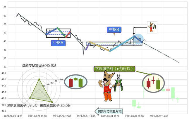 ➢ 下跌镊子线(n形磁铁) 🔜 缠论中枢点破位中枢B支撑下拉 综合量化分数:48.55 【中性】