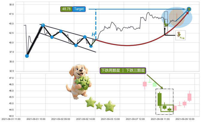 ➣ 下跌两颗星 | 下跌三颗星:形态走势中途换挡蓄势的表现,后市极有可能加油提速下跌,短期内展开新一轮的下跌行情