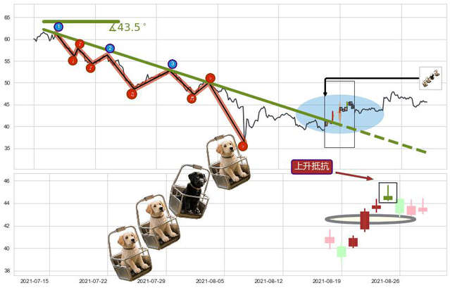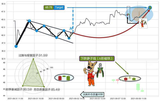 ➢ 下跌镊子线(n形磁铁) 🔜 降旗形临近target阻力拐点下跌 综合量化分数:47.11 【中性】