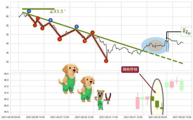 ➢ 🕰 价格走势在2021-09-01 12:00:00至2021-09-01 14:00:00期间形成降势停顿,残存影响值:6.24