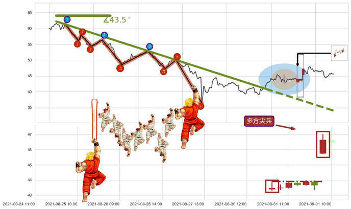 ➢ 🕰 价格走势在2021-08-31 09:00:00至2021-09-01 09:00:00期间形成多方尖兵,残存影响值:5.80