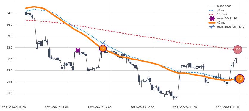 下跌趋势08-05 10:00-08-27 11:00,均线40确认关键阻力1处