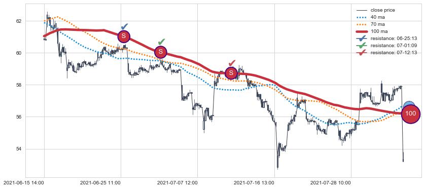 上涨趋势05-14 10:00-06-10 10:00,均线40, 100确认关键支撑2处