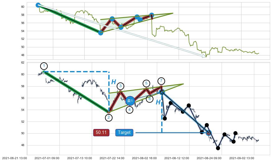 从2021-08-03 15:00至2021-08-24 10:00,共包含95个小时,阶段股价下跌-15.66%,阶段股价变动位移路程比: 1 : 3,下跌趋势角度: 56.7,2021-08-04 09:00向↘︎形成缺口,跳空下跌-8.17%˚