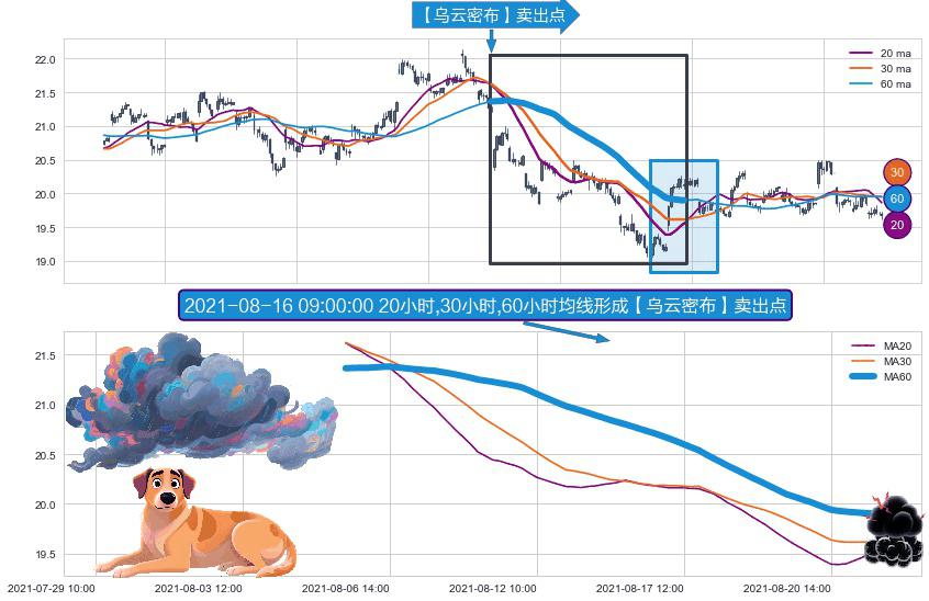 形态多维评估: ⚀ 2021-08-05 14:00:00小时-2021-08-24 09:00:00小时显现 20小时-30小时-60小时均线 【乌云密布】卖出点 看空信号,后市看跌,卖出