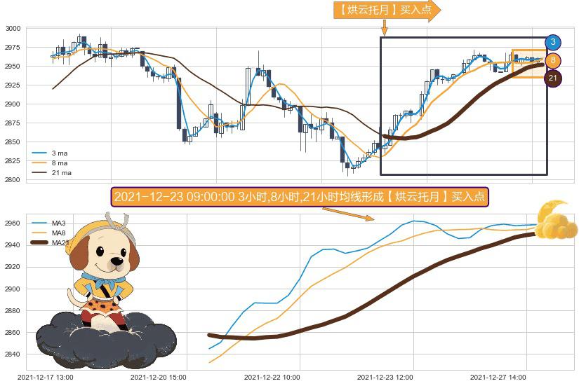 形态多维评估: ⚀ 2021-12-21 10:00:00小时-2021-12-27 16:00:00小时显现 3小时-8小时-21小时均线 【烘云托月】买入点 看多信号,后市看涨,买入