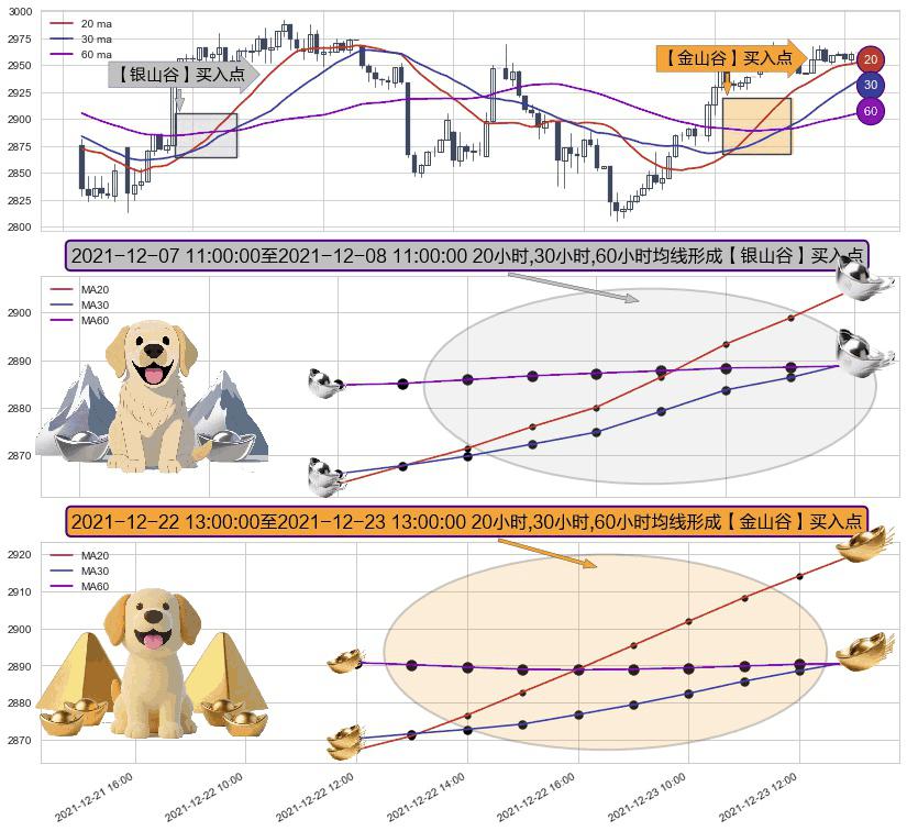 ⚃ 2021-12-22 14:00:00-小时至2021-12-23 13:00:00-小时显现 20小时-30小时-60小时均线 【金山谷】买入点 其再次确认了买入信号,可靠性更强,买入