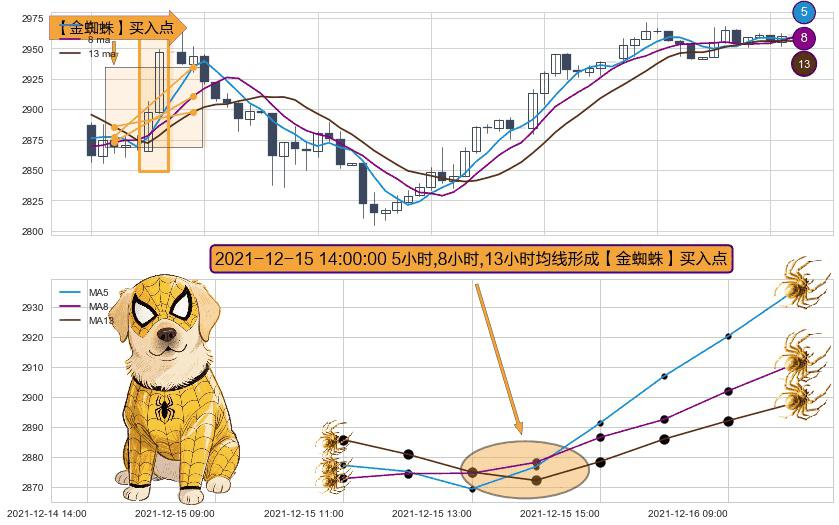 形态多维评估: ⚀ 2021-12-15 14:00:00小时显现 5小时-8小时-13小时均线 【金蜘蛛】买入点 看多信号,后市看涨,买入
